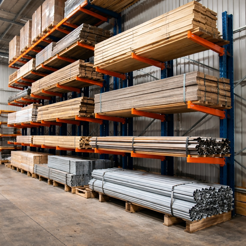 O sistema cantilever é indicado para armazenagem de materiais longos e volumosos, como tubos, perfis metálicos, madeiras e chapas. Sua estrutura aberta facilita o manuseio e o acesso aos itens armazenados.
